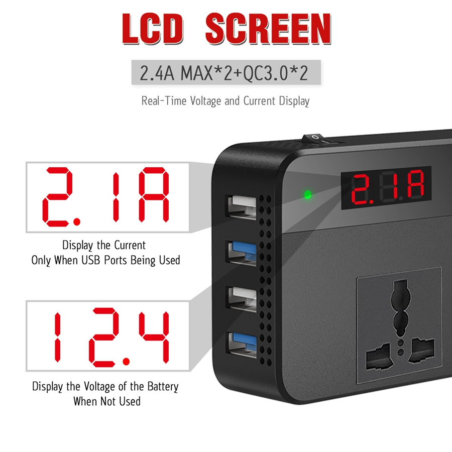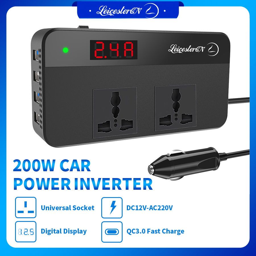 LST 200W Car Power Inverter Converter DC12V to AC220V 2 AC Outlets 4 USB Charger (2.4A MAX*2+QC3.0*2 Fast Charging) Car Accessories Power Converter with Digital Display