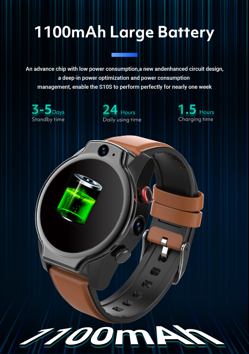 * Capacity: 1100MAH Ploymer Li-Battery A largest watch battery, it can help you extend the time of your watch.(When selecting a specification, the maximum option is only greater than 450 mA. The actual battery capacity of the LEM14 is 1100 mAh)