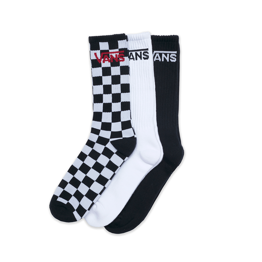 The Classic Crew Sock is a pack of crew socks with a jacquard Vans logo. Checkboard crew socks are made of 48% nylon, 47% cotton, 4% elastodiene and 1% elastane. Black & White crew socks are made of 77% cotton, 12% nylon, 7% polyester, 3% elastodiene and 1% elastane.