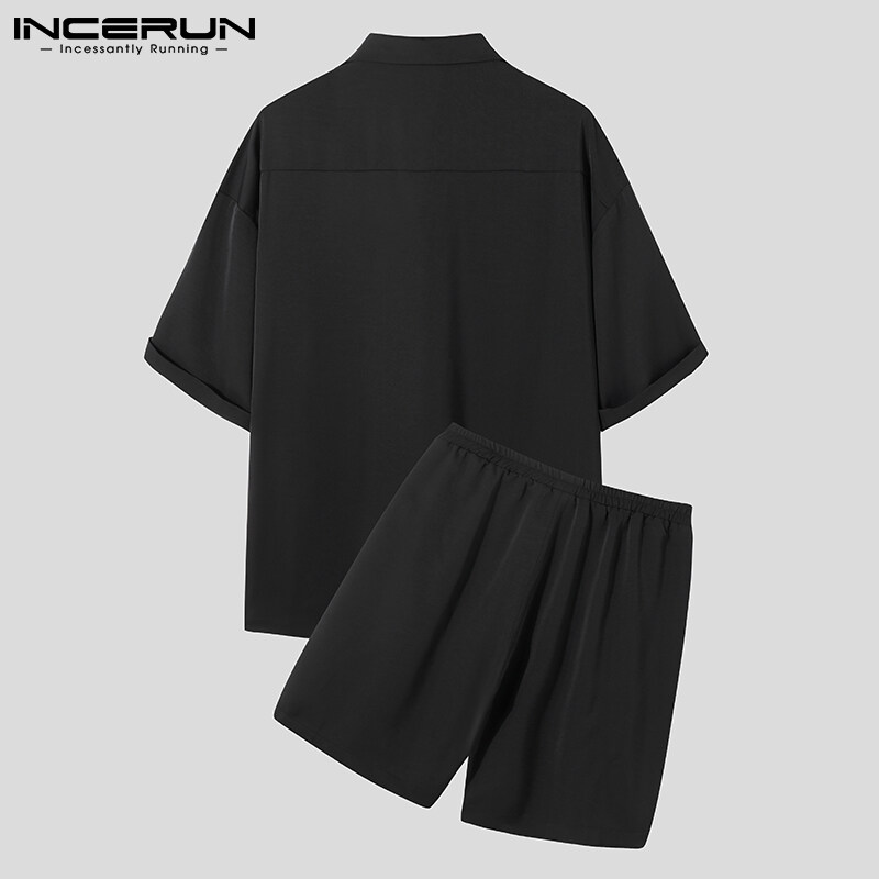INCERUN Men Short Sleeve Korean Style Casual Suits Button Shirts Elastic Waist Short Sets (Korean Style)