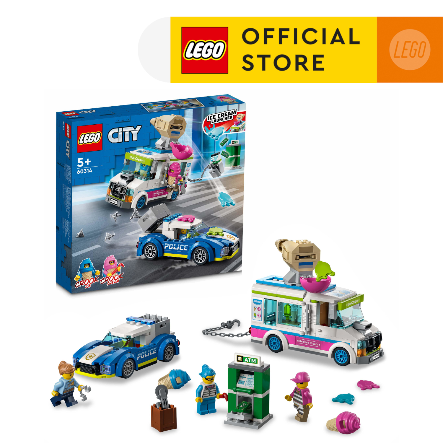A crooks’ ice cream van, a cool police interceptor and 2 LEGO® City TV characters set the scene for action-packed play.