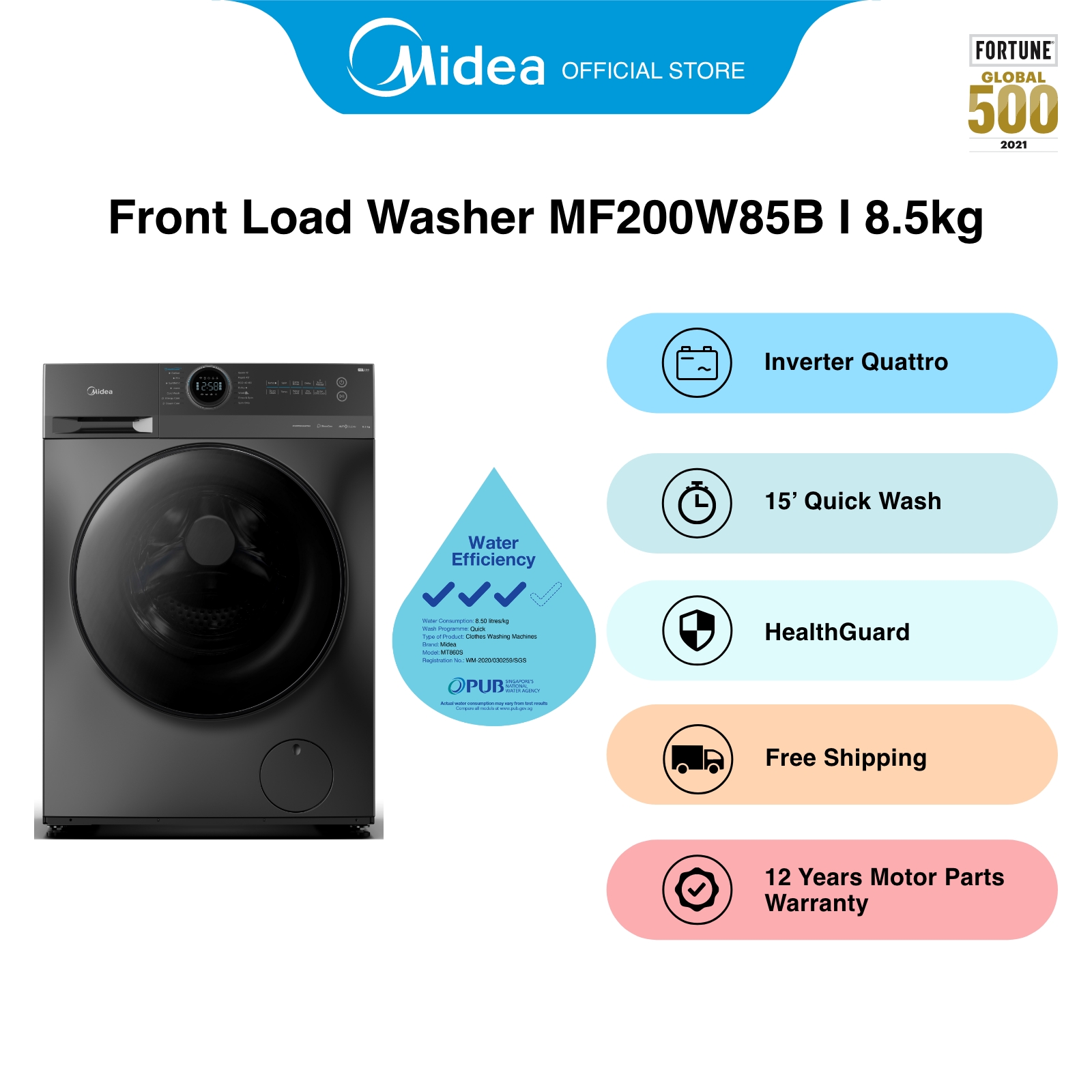 [Bulky] Midea MF200W85B Grey Health Guard Plus Inverter Quattro Front Load Washer, 8.5kg, Water Efficiency 3 Ticks