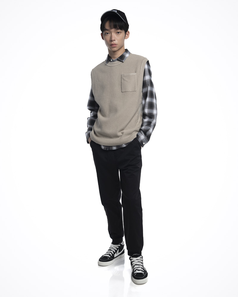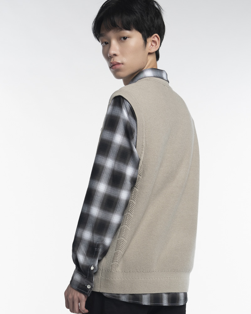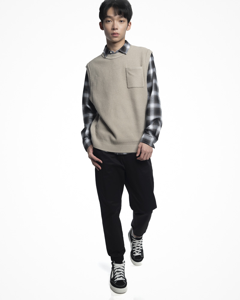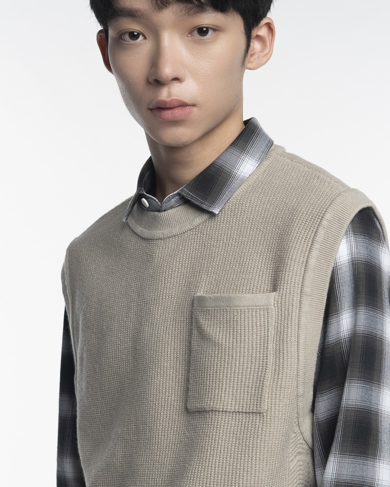 Regular Knitted Round Neck Vest with Ribbed Texture Details and Hem. Comes with Chest Pocket at the front. Made of cotton.