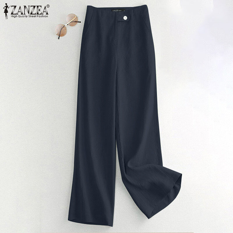 ZANZEA Women Vintage Cotton Side Pockets Trousers Casual Loose Plain Front Zipper Straight Pants #2