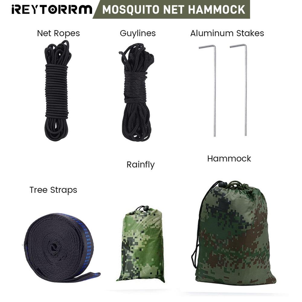 【EVERYTHING INCLUDED】: No need to look elsewhere! We include 2 long tree straps .( per straps/10 feet), 2 aluminum wiregate carabiners, 2 net ropes and a hammock with bug net. In addition, we also include 4 guylines, 2 aluminum stakes and a waterproof rainfly.