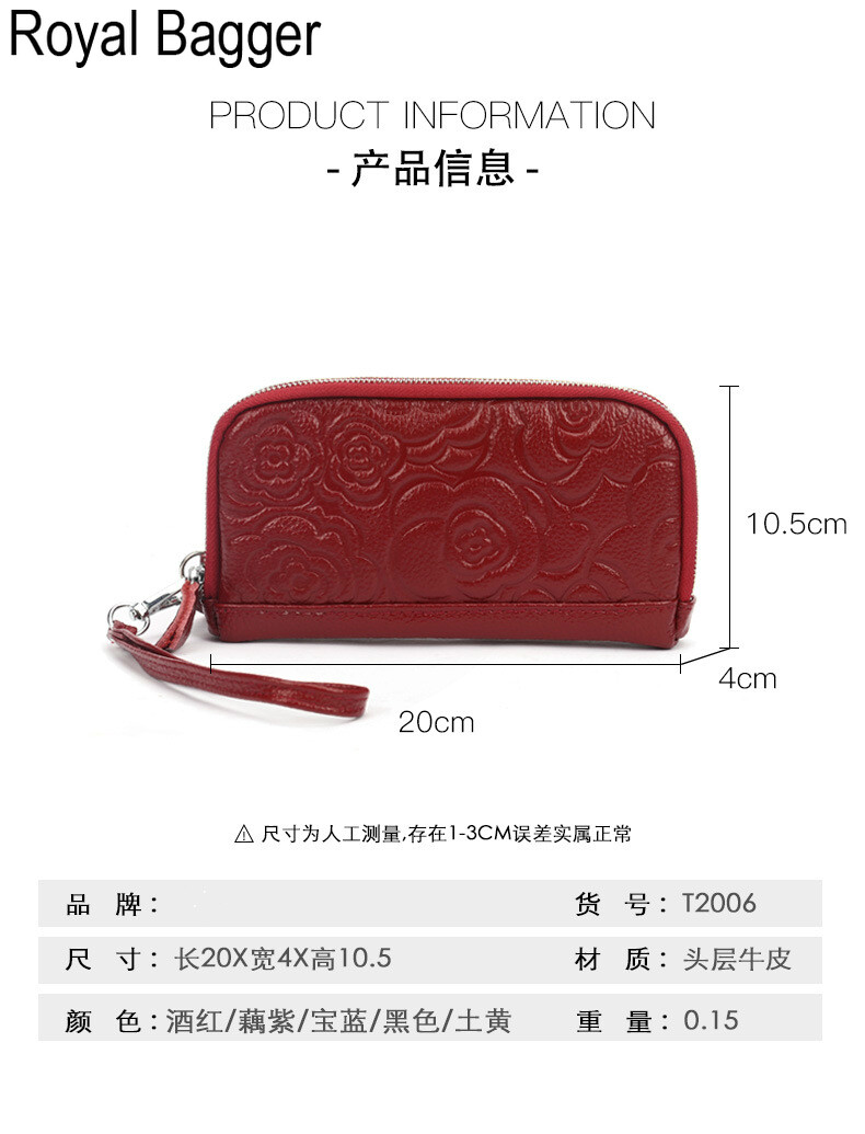 Royal Bagger Genuine Cow Leather New Fashion Double Zipper Flower Long Wallet Purse For Women Girls Super Hot High Capacity Clutch Bag Handbag Women's Multifunction Bags Casual Multi-Card Position Wal